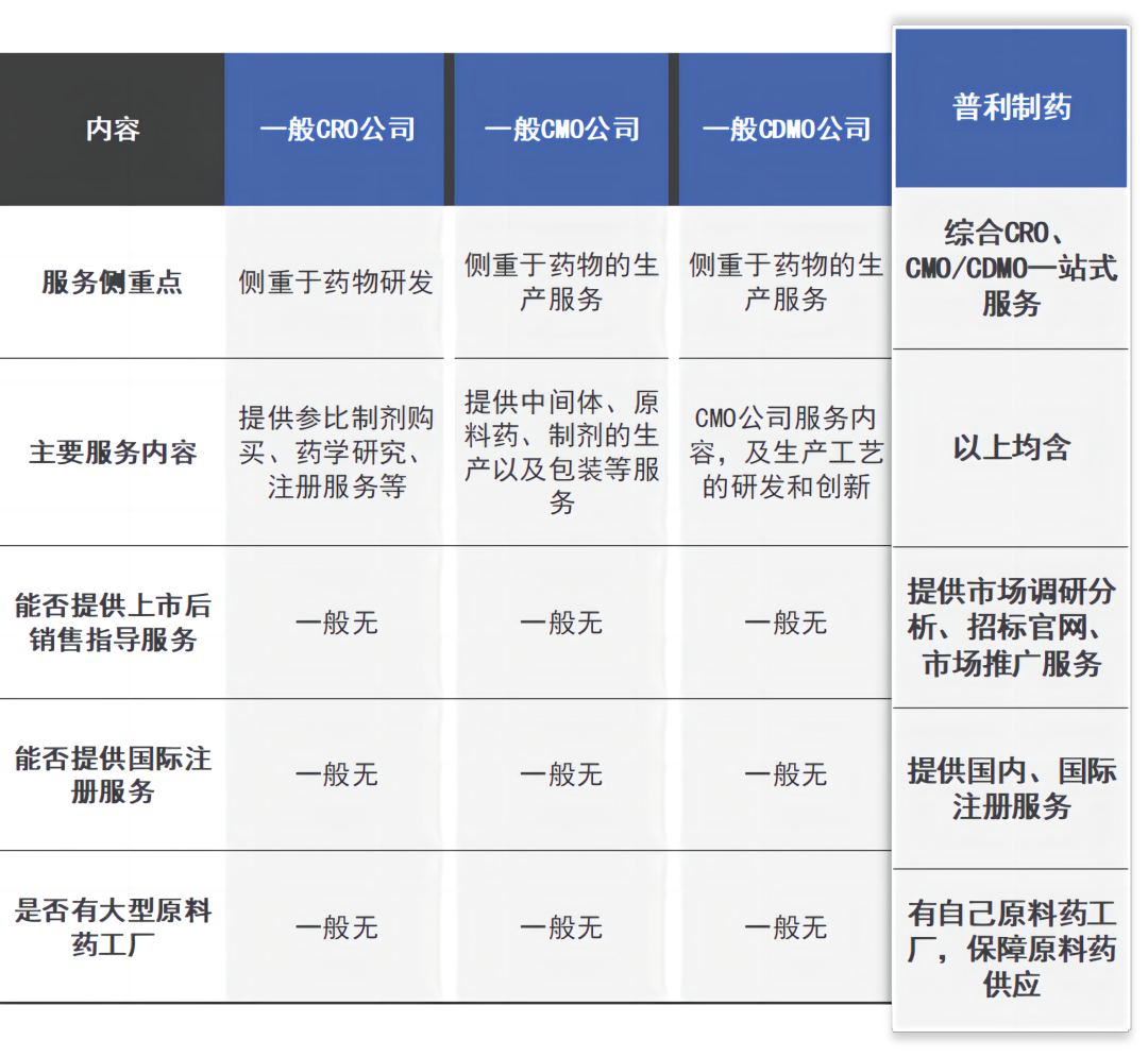 (1)综合性闭环服务:普利制药作为综合性药企,区别于一般CRO、CMO及CDMO企业,拥有CRO公司研发注册和CMO/CDMO公司委托生产的综合能力,帮您快速走完从项目立项、研发、注册、生产、销售的MAH持证的完整闭环。