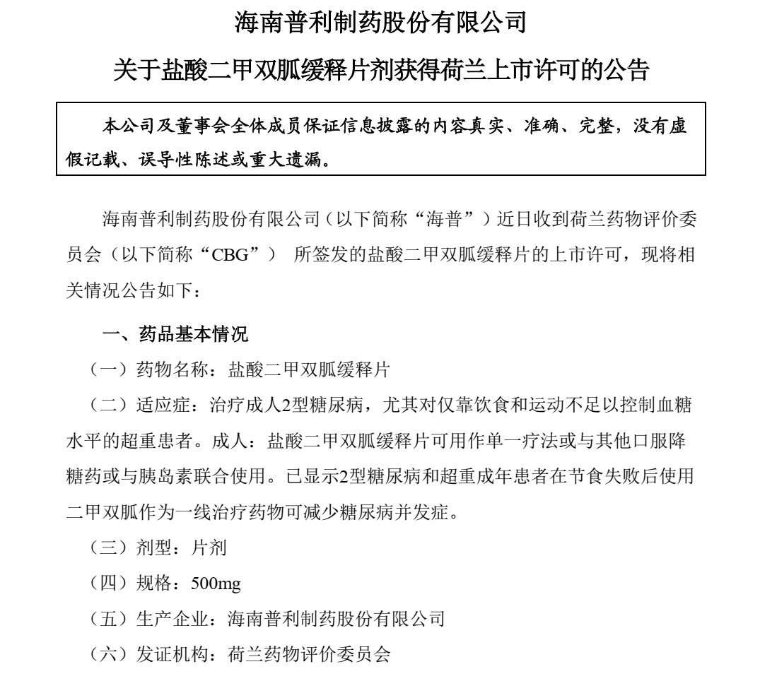 此外, 普利制药盐酸二甲双胍缓释片(500mg)收到了荷兰CBG所签发的上市许可,标志着普利制药具备了在荷兰销售盐酸二甲双胍缓释片的资格,也标志着唐必呋不止是普通的二甲双胍,而是具有出口品质的二甲双胍,其质量、疗效、安全性获得国内外广泛认可。